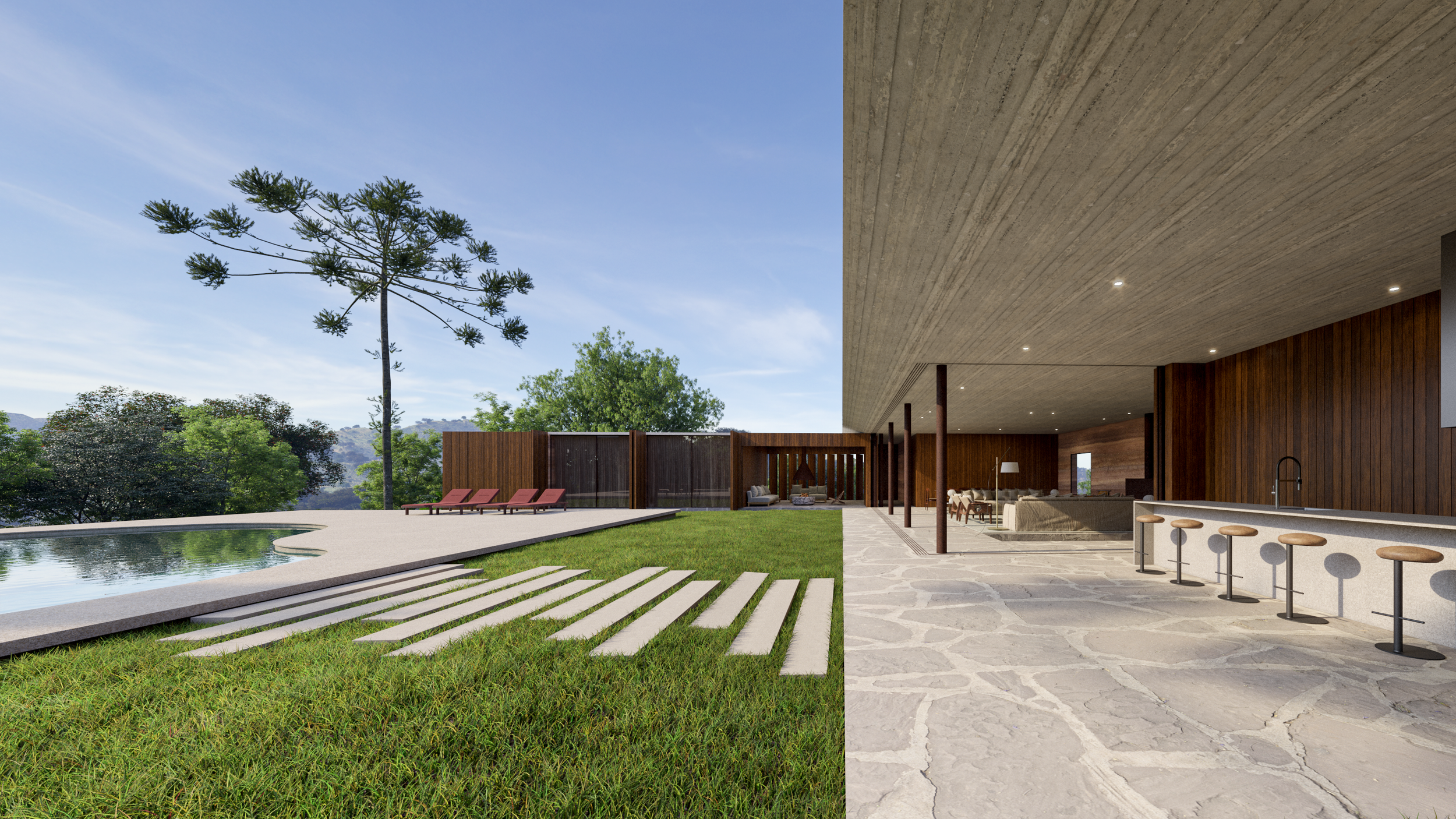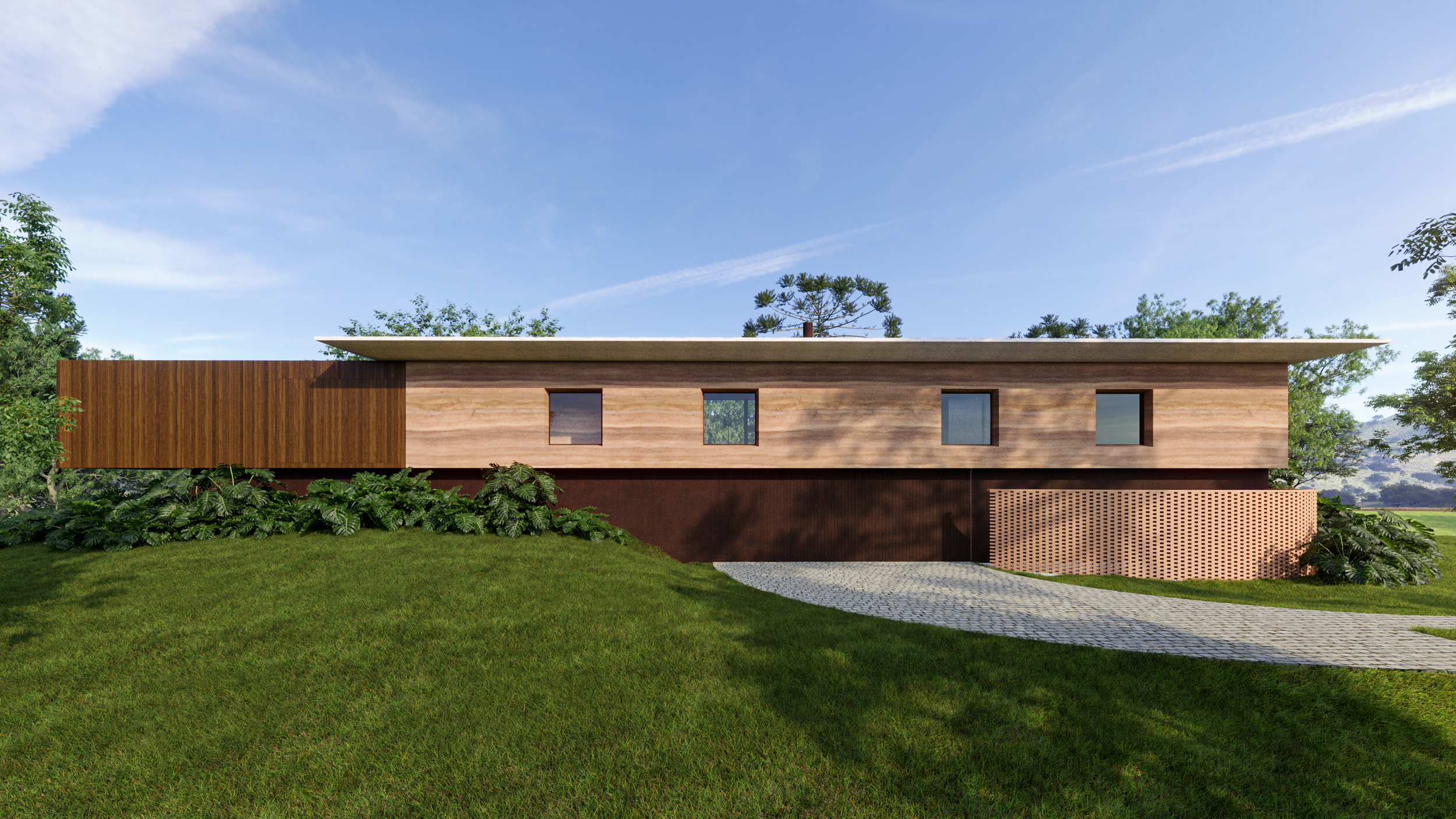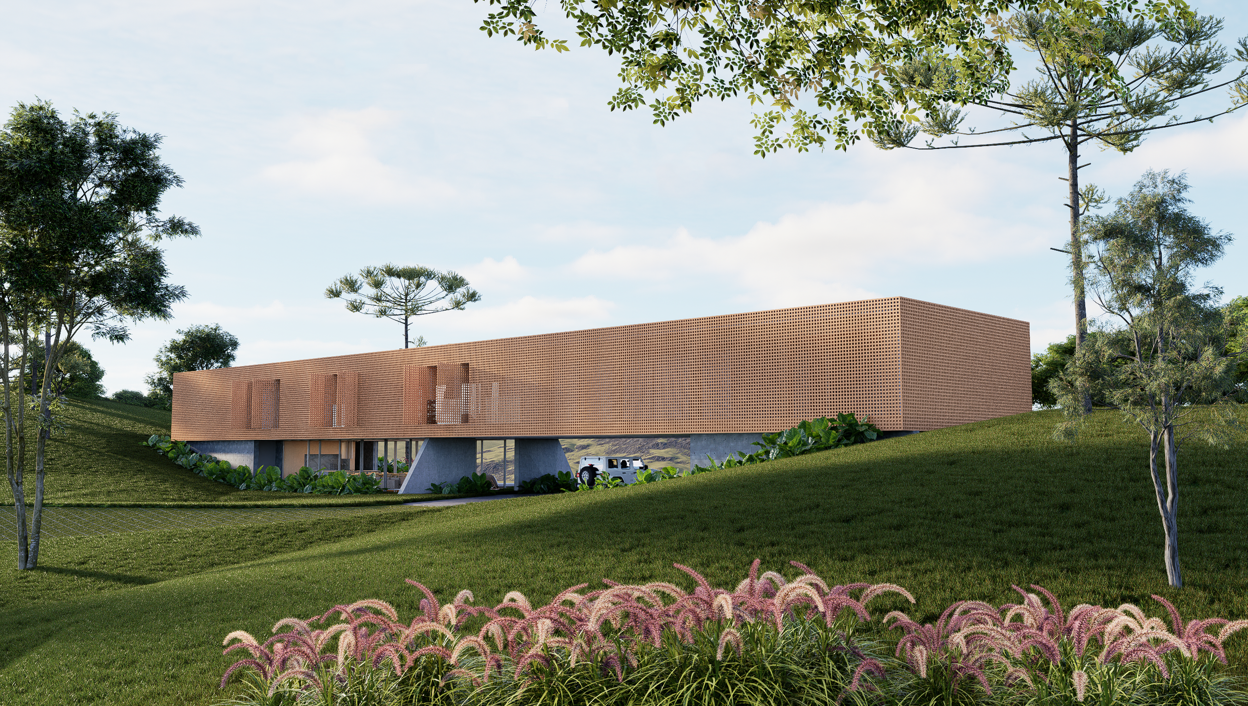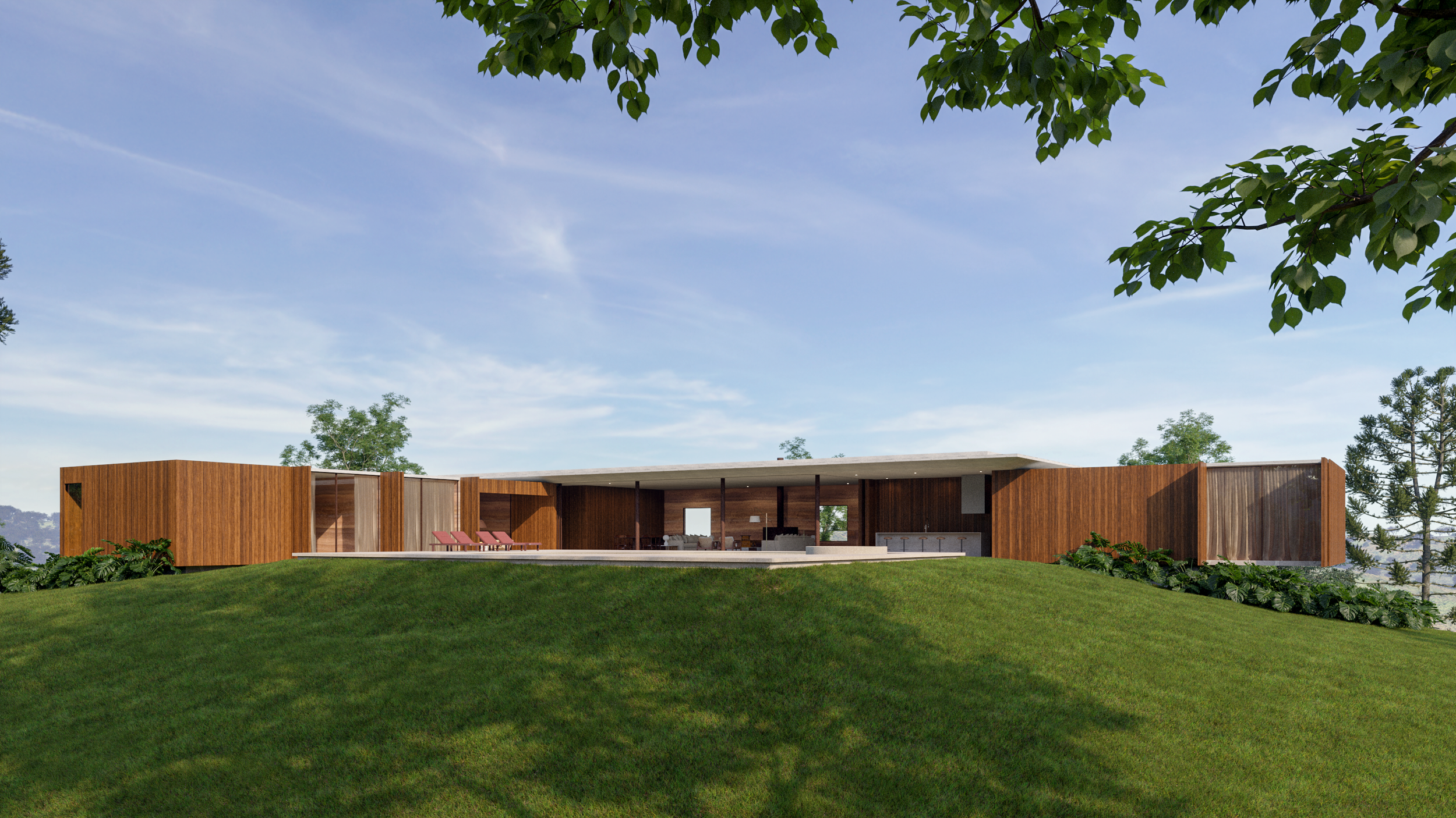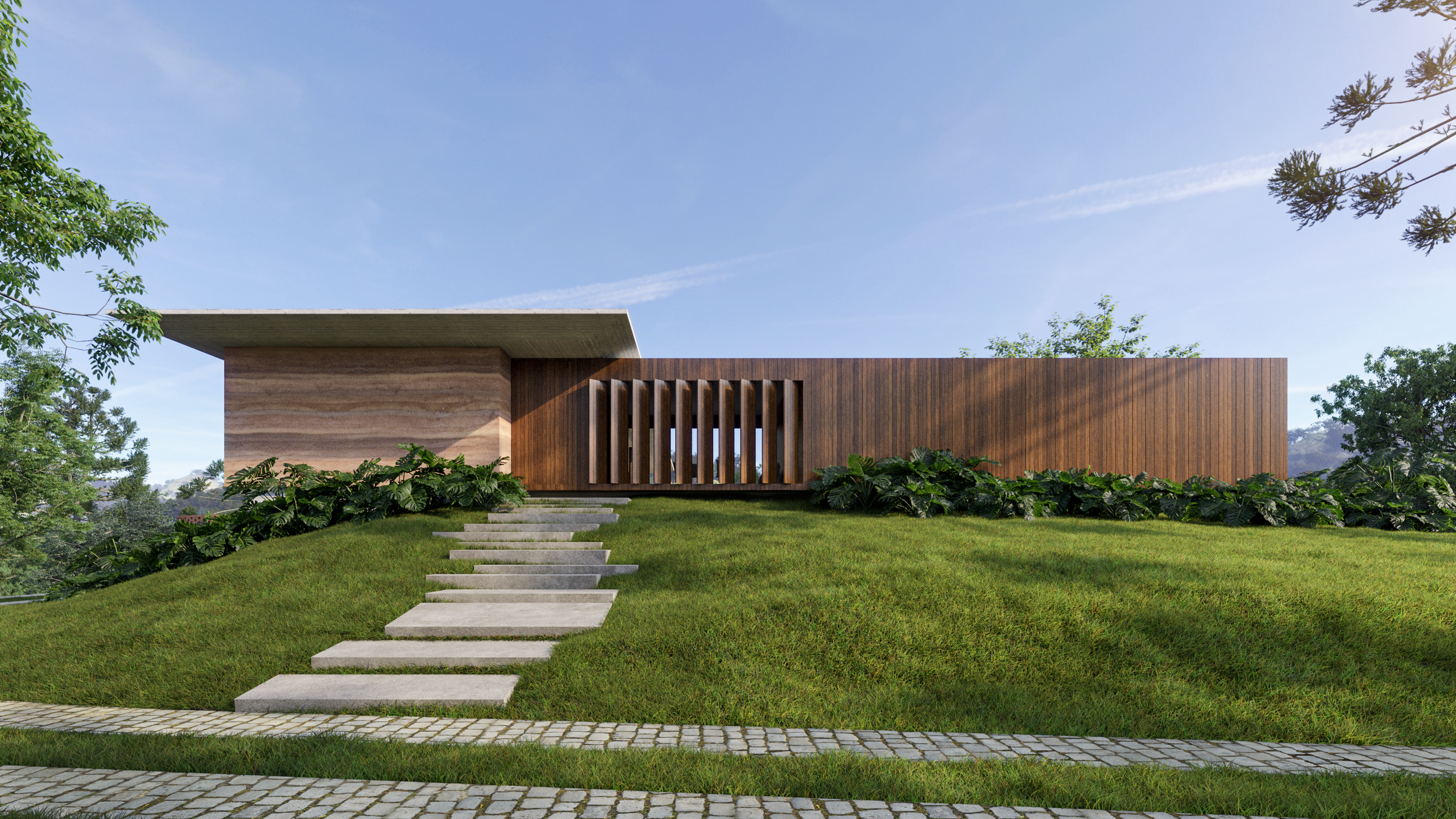 A cobertura horizontal em concreto unifica o conjunto, enquanto o embasamento absorve a topografia com leveza.