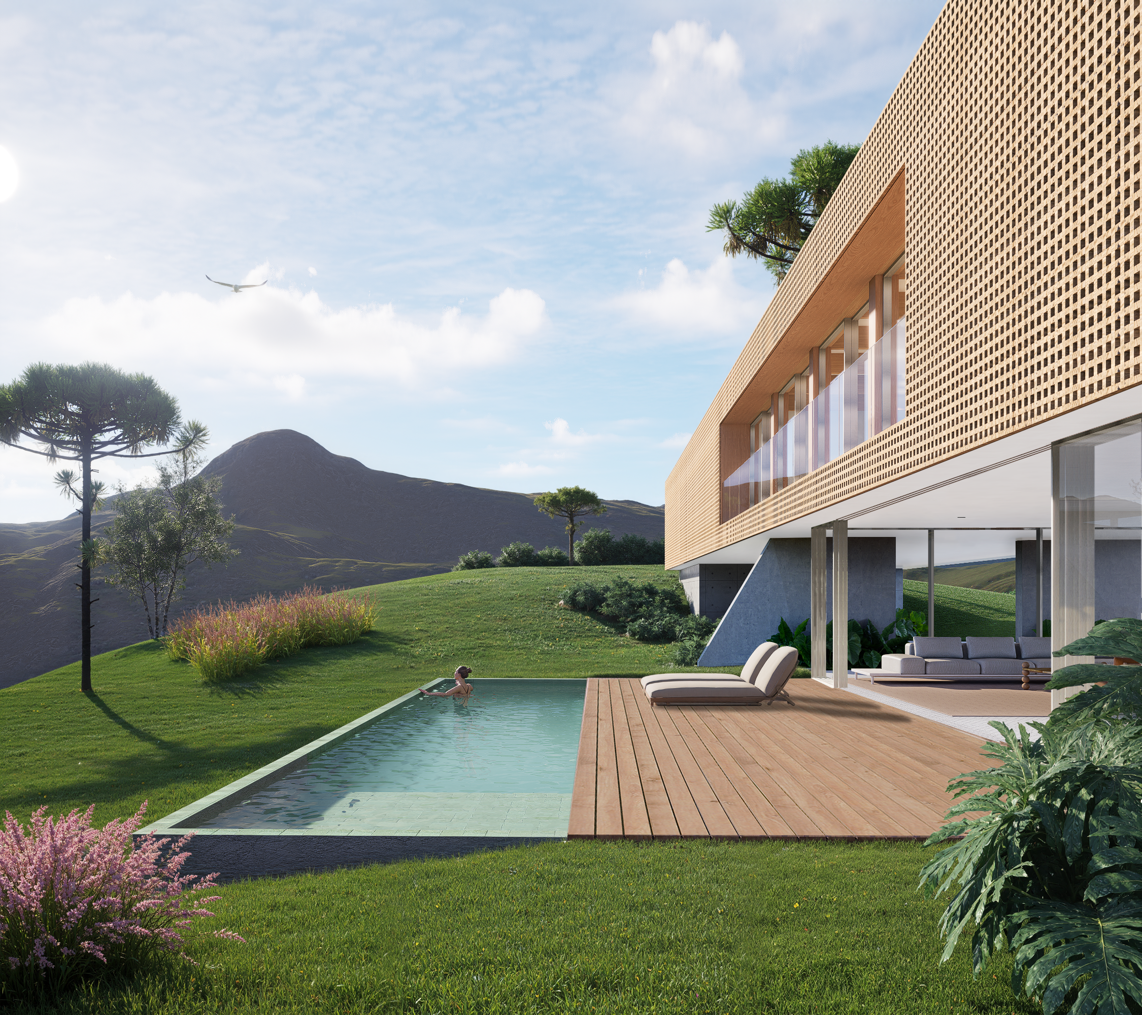 A madeira aparece como protagonista, reforçando a integração natural e o conforto térmico. Implantada em terreno de cerca de 500 m², valoriza espaços externos que dialogam com a residência. É uma tipologia sofisticada, pensada para famílias que buscam qualidade de vida em um projeto moderno, equilibrado e elegante.